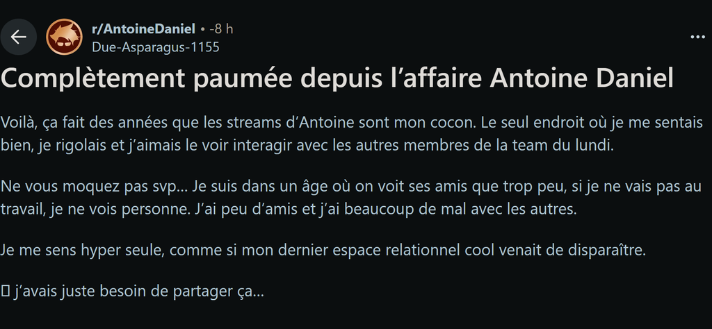 antoine daniel au lieu d'assumer ce qu'il a fait et de garder sa communauté de non-golems, a preferé chialer comme un lâche en espérant que les gauchiste le pardonneront, ce qui n'arrivera jamais, il a voulu preservé tout sa communauté pour continuer de gagner un maximum de fric et fini par se faire mépriser par tout le monde