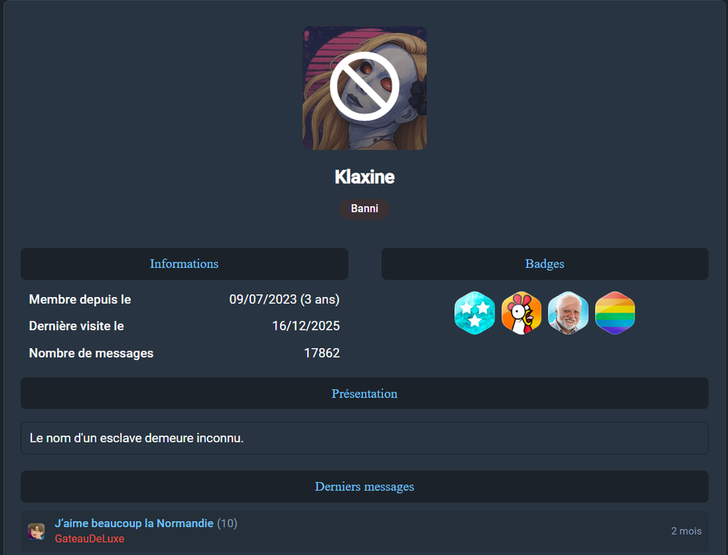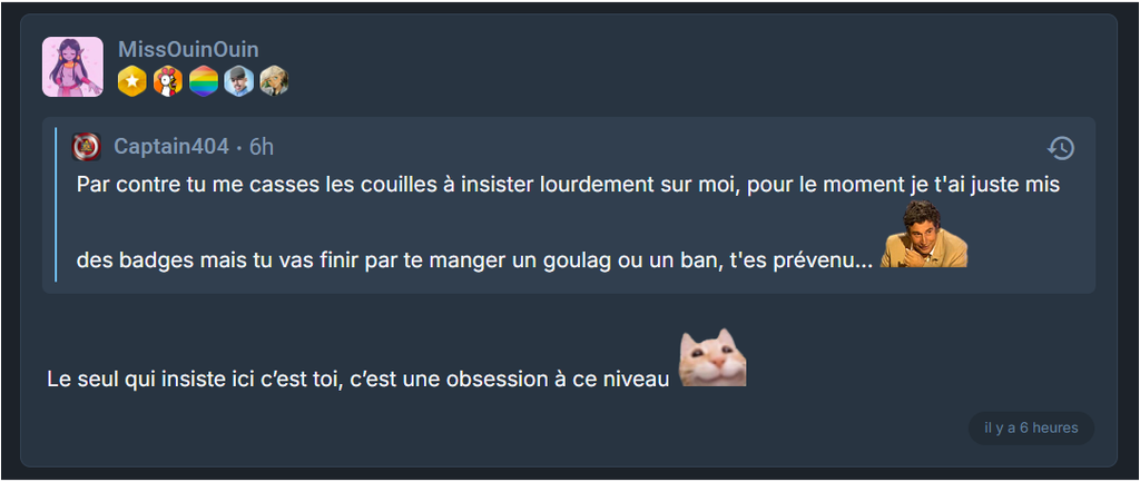 Depuis des semaines, @Captain404 spamme des badges négatifs sur mon compte, quand un modo / admin les retire, il les remet quasiment aussitôt, ce n'est visiblement pas pour "plaisanter", c'est juste une obsession / du harcèlement, j'ai demandé les raisons d'attribution des badges, aucune réponse, je ne peux même pas le contacter par message parce qu'il m'a bloqué, preuve de plus qu'il a spécifiquement quelque chose contre moi et profite de sa position pour m'attaquer.