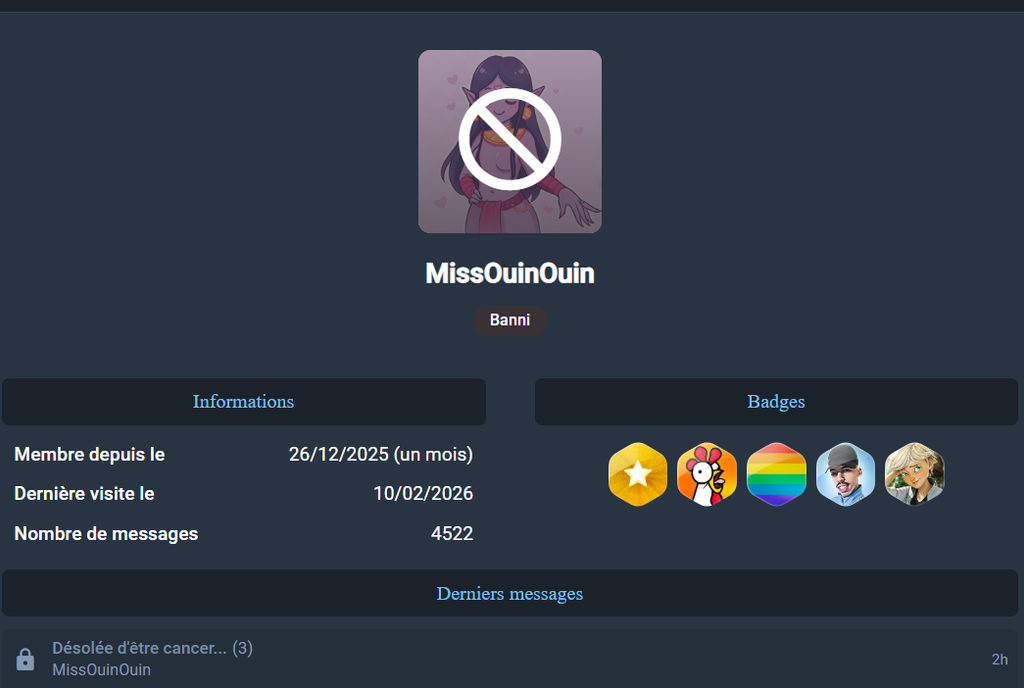 J'ai cliqué sur son profil et c'est indiqué qu'il a le statut de banni, malheureusement.