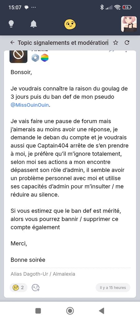 je me suis fait ban 2 jours pour avoir dit qu'un modo est un probleme