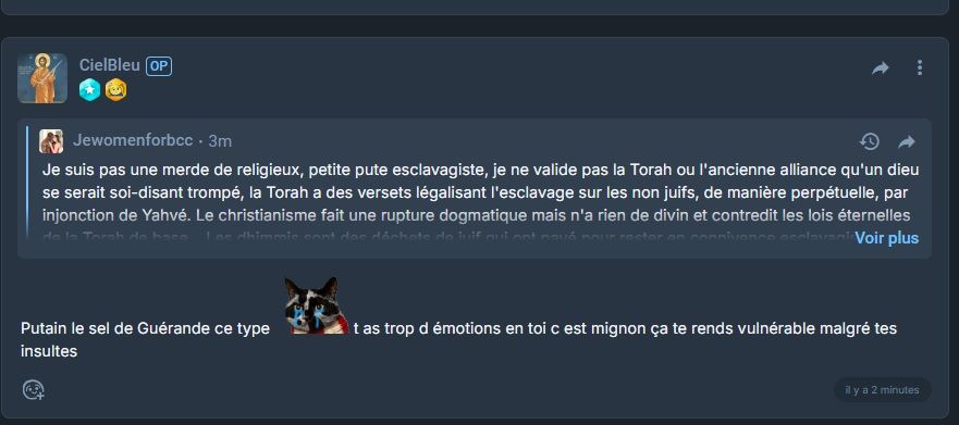 Tu me dis dhimmi, tu me dénigres en soumis juif qui paie pour vivre en terre d'islam, je ne suis pas juif, je ne suis pas une pute d'esclavagiste.