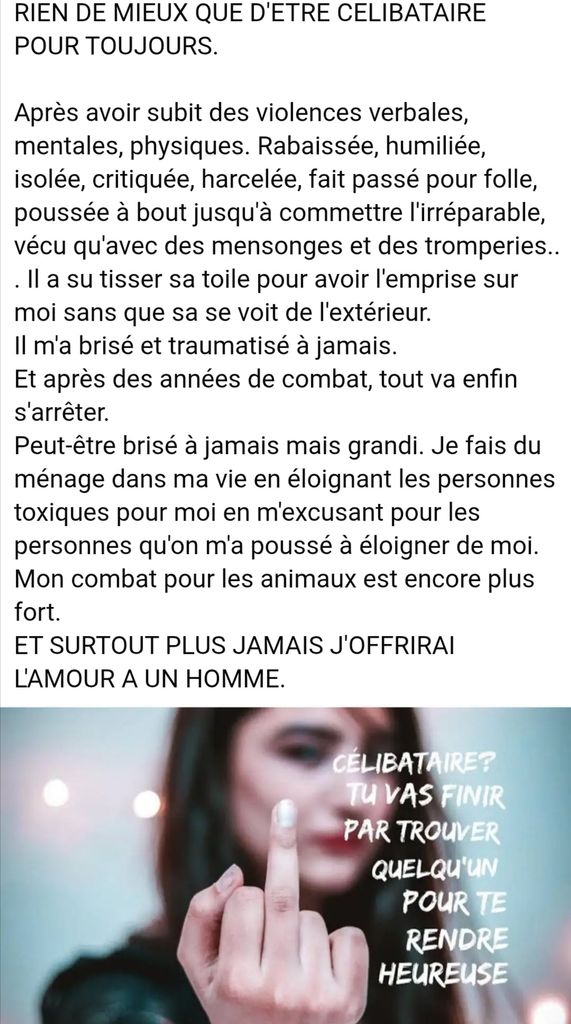 Elle voulait un "badboy" cette conne sr rend compte que finalement il est trop "bad". Et plutôt que de reconnaitre se mauvais choix elle finit par accuser tout les hommes histoire de ne pas se remettre en question pour ne pas se faire de mal