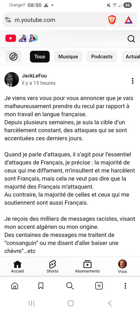 Je viens vers vous pour vous annoncer que je vais malheureusement prendre du recul par rapport à mon travail en langue française. Depuis plusieurs semaines, je suis la cible d’un harcèlement constant, des attaques qui se sont accentuées ces derniers jours. Quand je parle d’attaques, il s’agit pour l’essentiel d’attaques de Français, je précise : la majorité de ceux qui me diffament, m’insultent et me harcèlent sont Français, mais cela ne veut pas dire que la majorité des Français m’attaquent. Au contraire, la majorité de celles et ceux qui me soutiennent sont aussi Français. Je reçois des milliers de messages racistes, visant mon accent algérien ou mon origine. Des centaines de messages me traitent de “consanguin” ou me disent d’aller baiser une chèvre”…etc Je sais que beaucoup d’entre vous n’ont pas eu vent de tout cela et tant mieux. Mais moi, malheureusement, je n’ai pas eu ce luxe. Tout cela m’a profondément blessé, moi et ma famille. Je dois donc prendre mes distances, peut-être temporairement, car je n’arrive plus à faire semblant, ni à passer outre. Et il est hors de question pour moi de dire le contraire de ce que je pense juste pour ne pas froisser un groupe d’intolérants même si cela “fait des vues”. Ma mère m’a éduqué autrement. J’espère que ma décision sera comprise, et que vous me pardonnerez cette faiblesse de ma part. J’ai toujours essayé de donner l’image d’une personne forte, mais quand même mes connaissances les plus proches minimisent ou justifient le harcèlement, je me dis que j’ai dû rater quelque chose. Alors une introspection s’impose, et elle prendra le temps qu’il faudra. PS : la leçon que je tire de tout cela, c’est que ceux qui parlent le plus finissent par façonner notre réalité politique, et que ceux qui se taisent deviennent leurs alliés. PSS : je voulais sincèrement apporter une nouvelle voie politique : une voie de gauche humaniste qui place la dignité humaine avant tout, intransigeante face à l’autorité religieuse, refusant l’amalgame, l’essentialisme et le racisme. Mais il faut croire que, ni à droite ni à gauche, on ne veut me laisser faire. Ma disparition semble souhaitée de part et d’autre. C’est donc avec beaucoup de peine, de douleur et un sentiment d’abandon que je vous dis farewell. Prenez soin de vous, et de vos proches, quelles que soient leurs religions