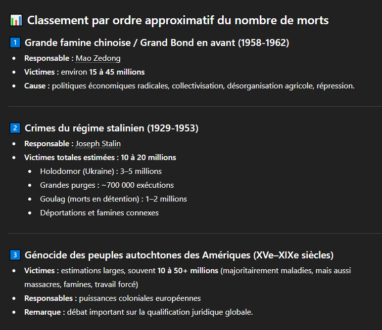 Nous n'avons pas par ailleurs créé les plus grands génocides, c'est Mao et Staline qui en sont responsables, donc des non Occidentaux et par dessus le marché des communistes.
