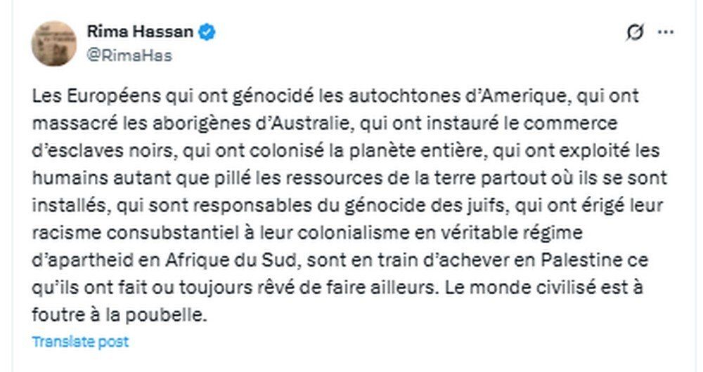 non mais c'est pas un tweet c'est tout ce qu'elle représente elle se son publique haineux de l'occident (même si je t'accorde qu'entre le soit disant droitard soraliste/bll et rima hassan y'a pratiquement aucune différence)