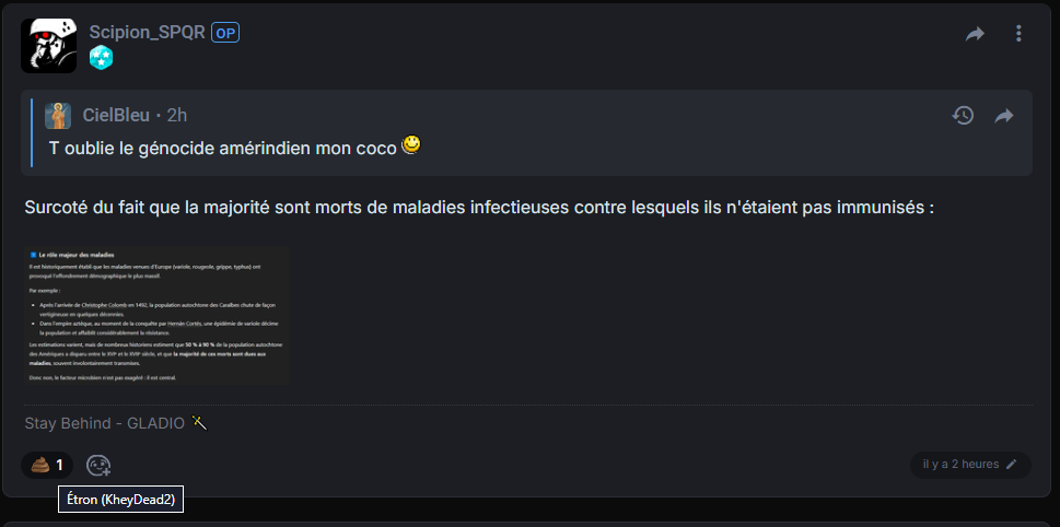 Kheydead rage par ailleurs que les blancs n'ont pas décimé la majorité des indiens d'Amérique par la guerre mais du à des virus par inadvertance :