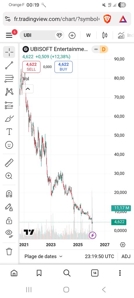 Graphique de l’action Ubisoft. Une bougie = une semaine :