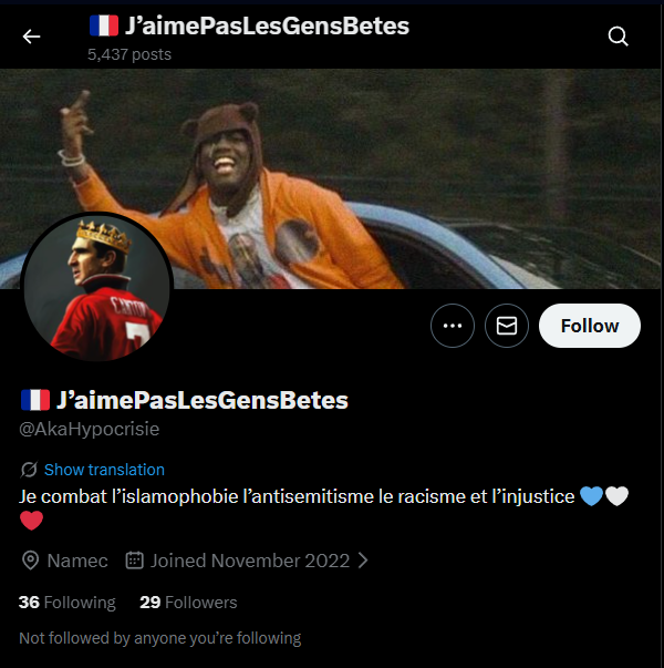 Bon je vous passe les détails, maghrébin, anti-raciste anti-droite, Soralien, antisioniste, etc