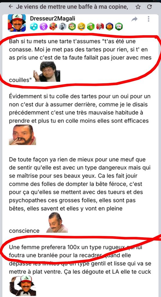 Non mais ce gars c'est un pseudo "male alpha" nationaliste ubermensch qui fume des joints, et à demi alcoolique, poste des photos intime de sa femme sur onche et, comme tu le dis, menace sa femme