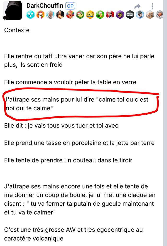 Parler de violence conjugal pour une petite baffe exceptionnelle quand certaines limites sont dépassées c'est un peu insultant pour les femmes qui se prennent des vraies branlées à base de coups de poings coups de pieds au quotidien