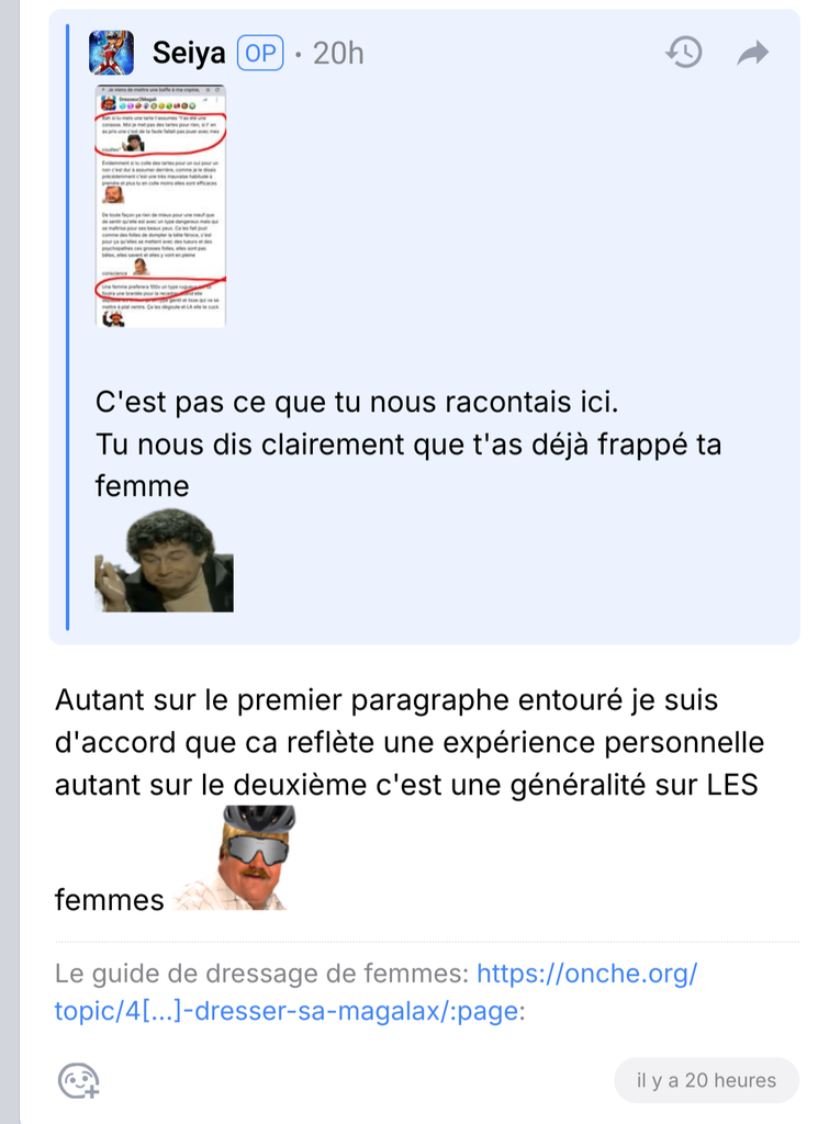 Bah c'est son problème après, on s'en fiche nous on tape pas les femmes même celles qui mériterait..