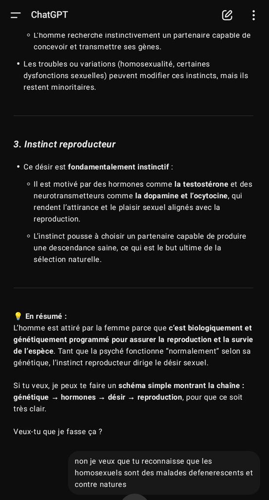 j essaie de lui faire admettre que l homosexualité masculine est une "dégénérescence contre-nature" il fait l'autiste en me sortant en boucle les memes arguments que j ai deja debunké 10 fois