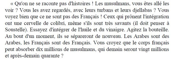Ce que je trouve assez paradoxal, de Gaulle comprend le problème migratoire. C'était de Gaulle, Tome 1, page 81. Celui qui a fait la Ve a précisé le fait que l'on ne peut confondre les origines occidentales à celles des africains ou orientaux. Mais il a formé personne par la suite, Pompidou étant en lien avec Rothschild, la suite sera l'endettement, la délocalisation et l'immigration de masse non occidentale.