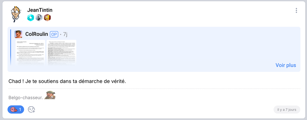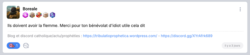 Ayyyyaaa ColRoulin qui remet à leur place les faquins suants prieurs d'arbres, c'est à dire dans leur chambre puant la pisse entrain de se branler sur un breton qui a souillé de lui-même la race qu'il aime temps.