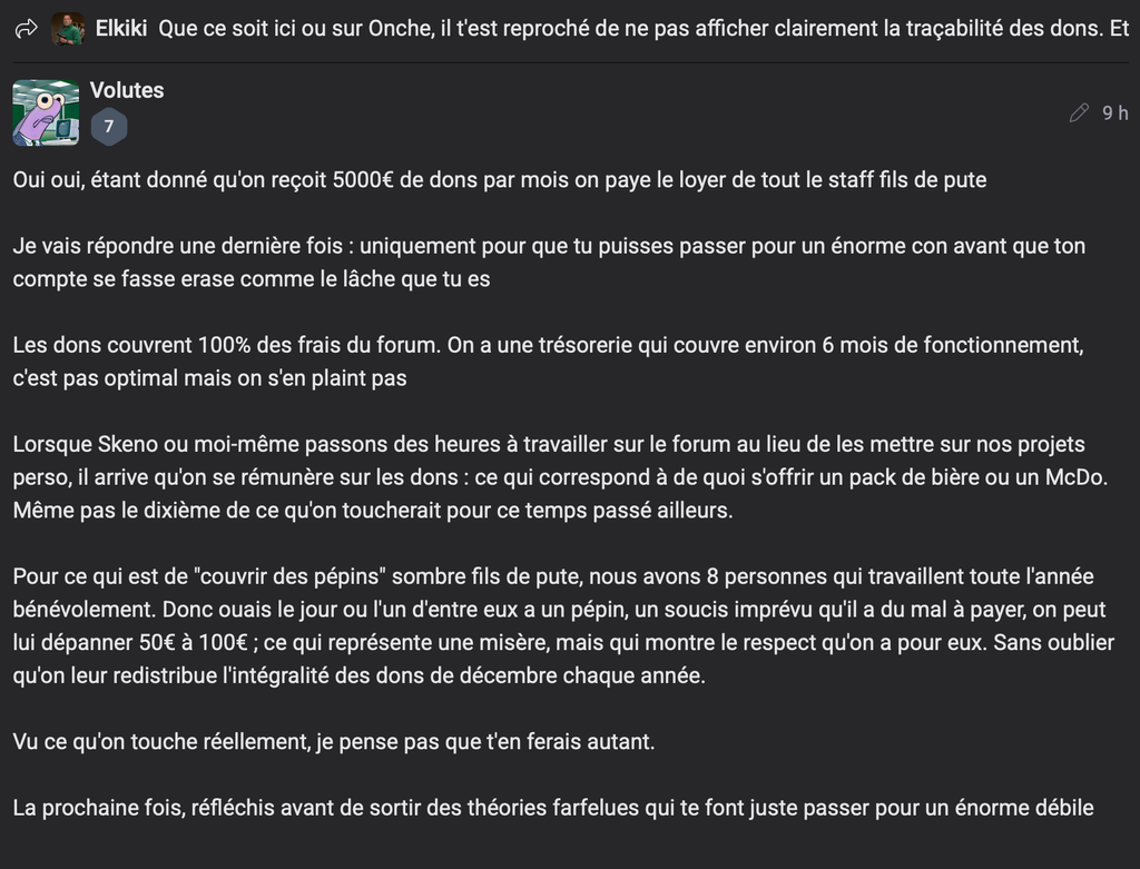 J'ai pas forcément pour objectif de me justifier auprès de la poubelle de Onche qui regroupe les pires cancers BAV, mais ils ont tendance à dire de la merde et ça méritait d'être recadré