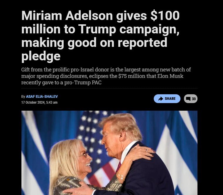 Miriam Adelson has delivered on a pledge she reportedly made at the start of the general election season, donating $100 million to a campaign committee supporting the candidacy of Donald Trump, according to disclosures filed Tuesday with the Federal Election Commission.