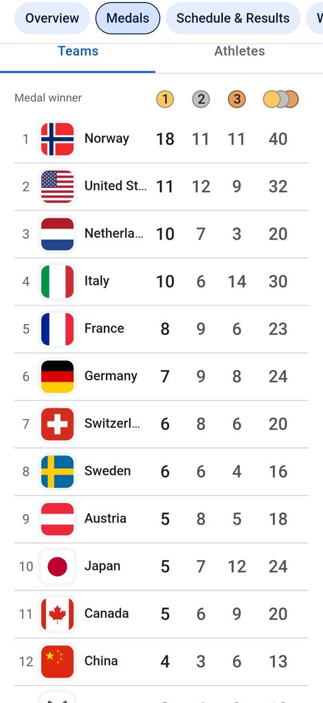 L'Italie qui n'a jamais remporté plus de 3 médailles dans les JO hiver et là parce que c'est chez eux, ils en ont eu 10