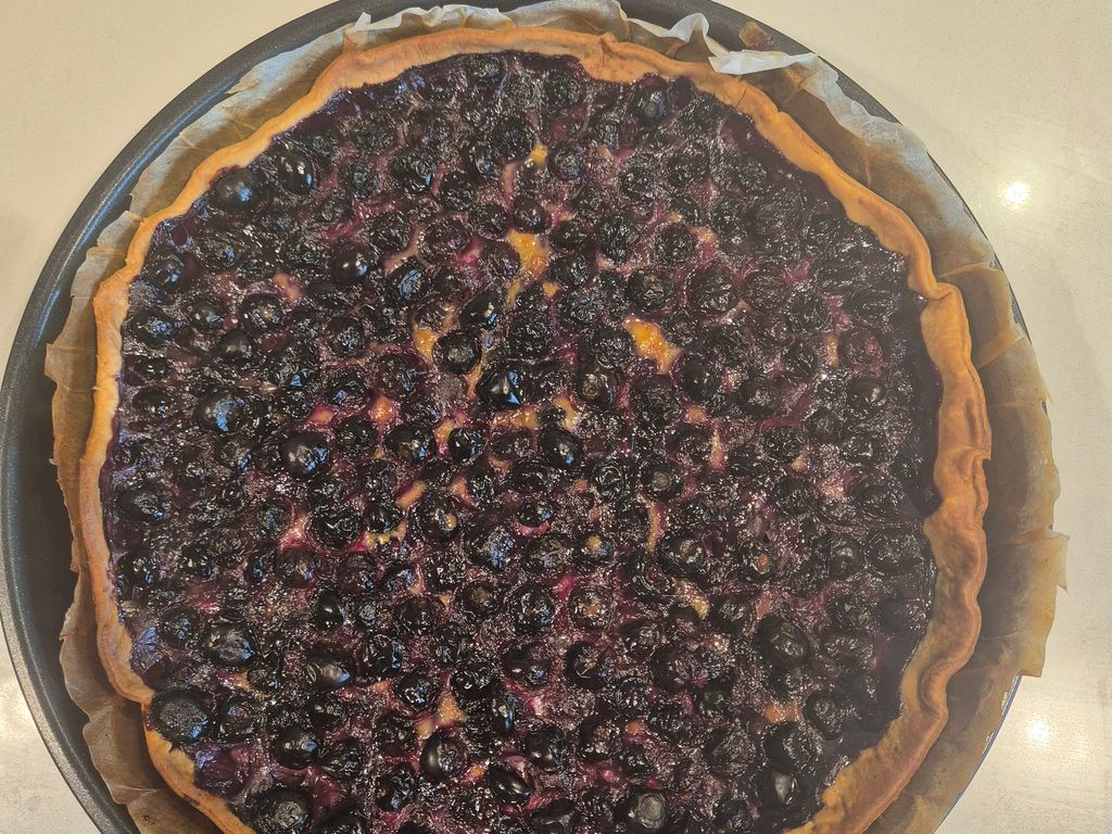 dernier post pour ce soir, une recette de ma grand mere, la tarte aux myrtilles, sur base amandes, avec un appareil aux oeufs.