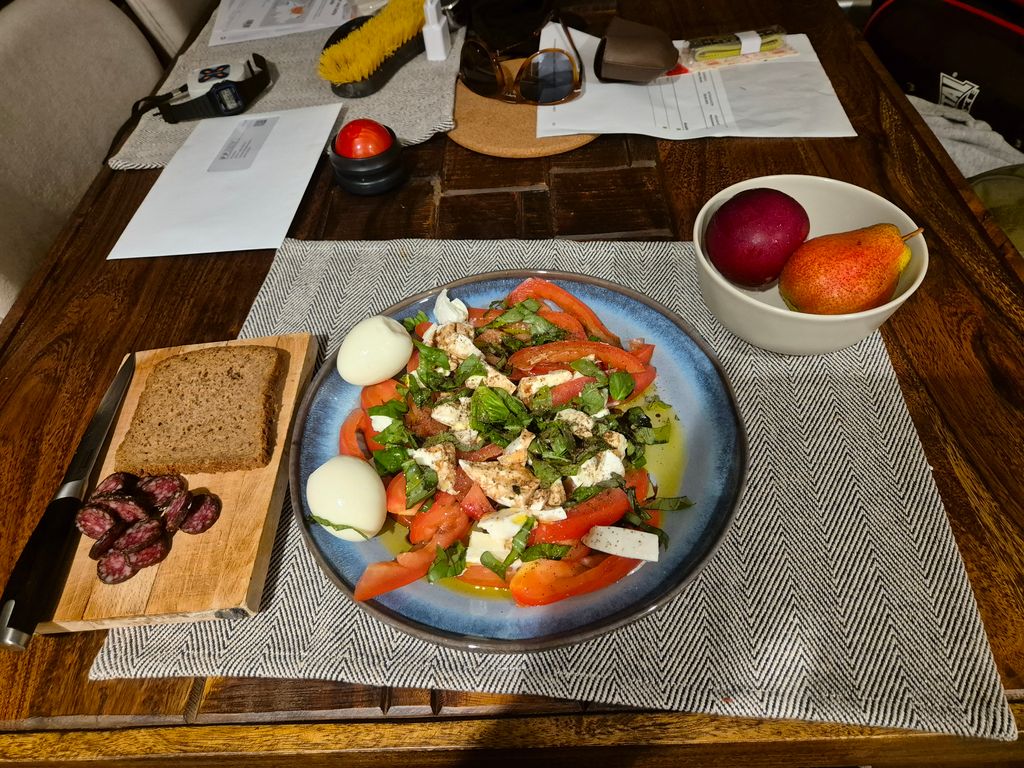 ici tomate coeur de boeuf, basilic, mozzarela di buffala, oeufs durs, saucisse sèche locale.