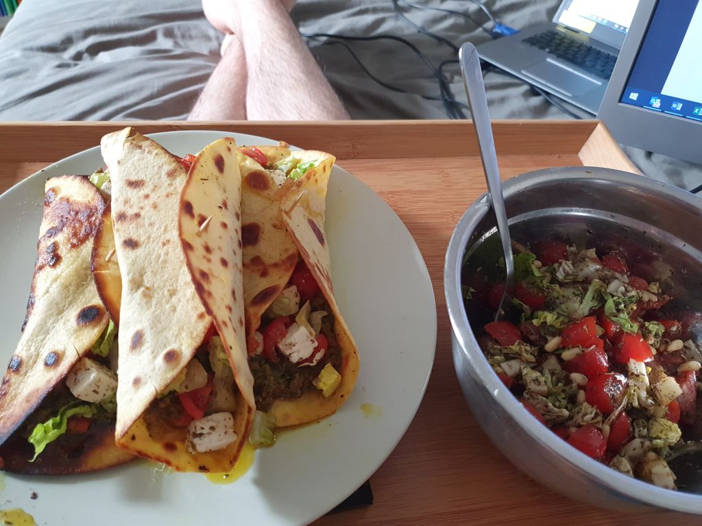 ici un menu un peu plus estival, des tacos, mais pas le truc de bougnoules, un peu plus frai, on distingue de la feta, des tomates cerises, de l'avocat, de la laittue, doit y avoir du poulet aussi, bref de quoi se peter le bide et faire une bonne sieste ensuite.