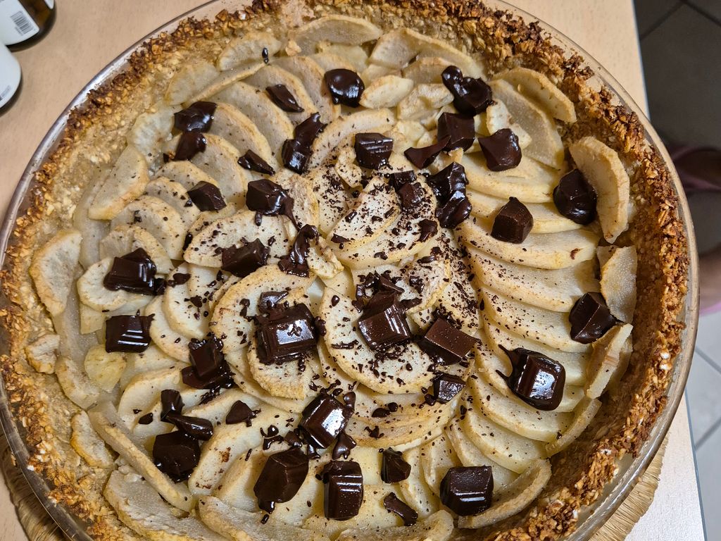 voici une tarte dont la recette avait été trouvée par ma mère sur instagram, soit disant recette "healthy", croute en flocon d'avoines, pores, pas d'appareil, quelques carrés de chocolat pour la gourmandise.