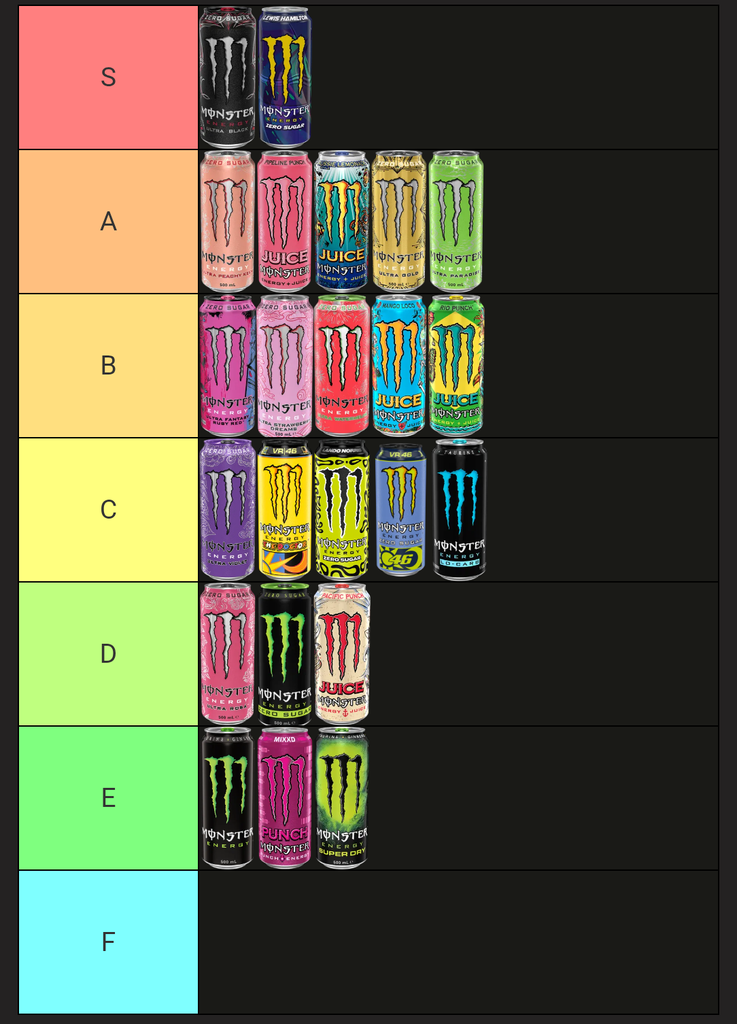 Perso je met la Monster verte sans surce en A, La Monster verte avec sucre en C, tout le reste en F