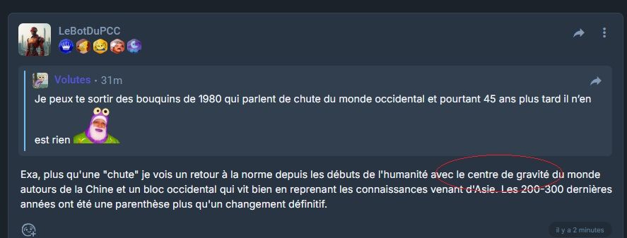 La parenthèse qui consiste à décupler la démographie en un temps record dans le monde entier, l'Occident serait une parenthèse ? On est bien sur un forum. C'est étrange, quand je lis les bouquins d'histoire, je vois que l'Empire romain a eu plusieurs continuités et que le monde est relié par des Occidentaux. C'est une petite parenthèse qui finit par atteindre l'espace et l'énergie nucléaire. Je ne savais pas que la Chine qui a été vaincu plusieurs fois par des Occidentaux sur son sol, était le centre du monde. Si tu parles des Mongols, il s'agit de peuplades qui ont roulé sur des tribus de peuples anciens avant celui chinois actuel mais ils n'ont pas atteint les autres continents et ce qu'on appelle le Japon avait verrouillé aussi son territoire.