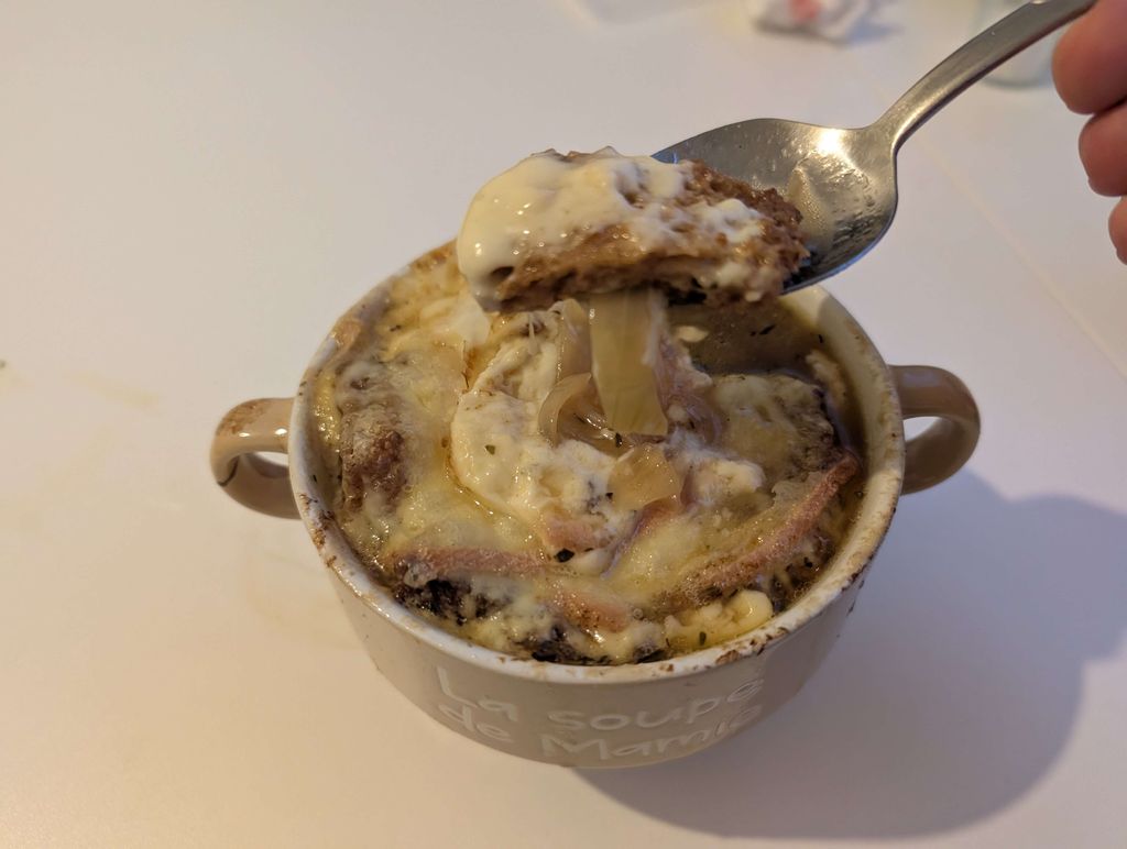 bha oui, la soupe est en dessous la tranche de pain avec du fromage dessus donc tu la vois pas, cest le principe de cette soupe