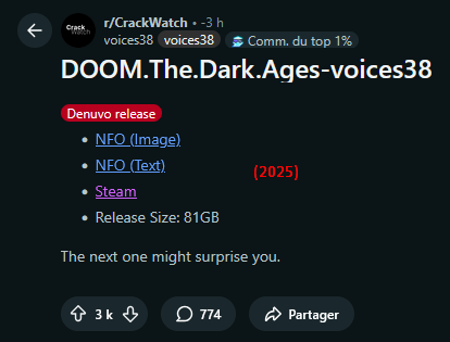Denuvo est devenu une vraie merde à retirer et maintenant qu'empress c'est retiré ça donne l'occasion à d'autre teams de s'y mettre comme ça été fait il y a pas si longtemps avec la sortie du crack de persona 5 royal