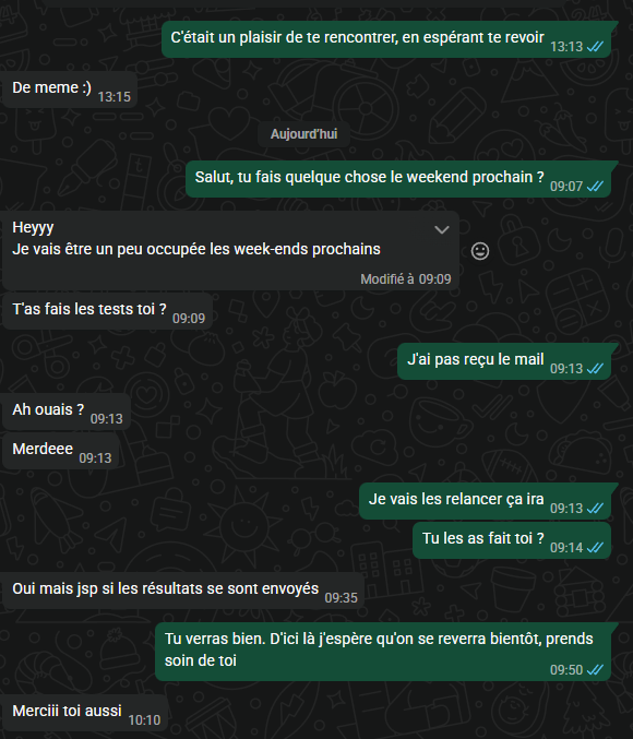 Elle t'a re proposé quelque chose ? en vrai c'est bien trop court comme conversation pour en juger mais j'espère que ça ira ! test MST ?