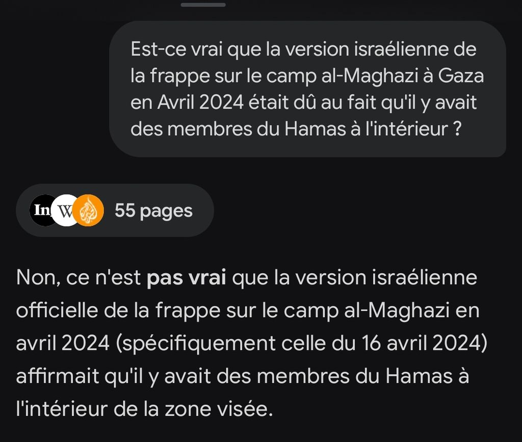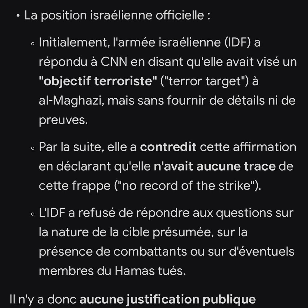 Par contre le fait qu'Israël a bombardé ce camp de réfugiés c'est un fait établi, qu'ils n'ont pas mentionné qu'il y avait bien des cibles du Hamas c'est également un fait établi, qu'il n y ait pas de preuves qu'il y avait bien des cibles du Hamas c'est également un fait établi, qu'il y avait des civils tués et que c'est une infrastructure non militante c'est encore une fois un fait établi