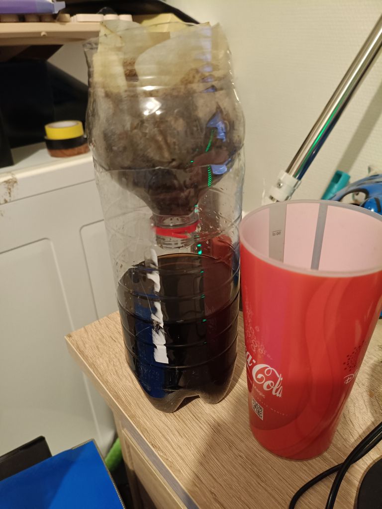 avec une bouteille, filtre a café et café moulue