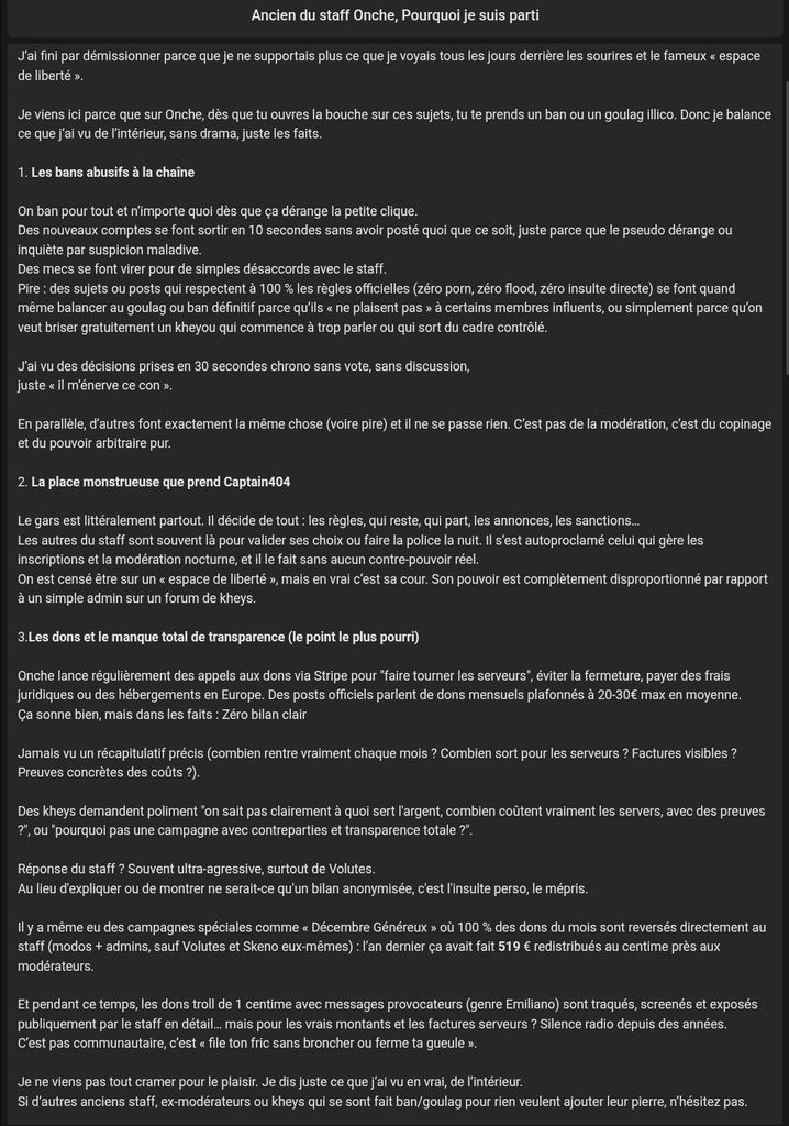 par contre tu as deux trois salope ultra susceptible pour une blague tu peux te prendre 15 jours de goulag pour rien juste car ils sont pote avec la modération/leche botte voir carrément leur gobe presque le chibre c'est véridique par contre ces même personnes susceptible eux peuvent faire les même blague voir bien pires ils ont 0 sanctions on va pas se mentir qu'il y a du copinage sans oublier les messages qui se font juste instant supprimer ou éditer par un certain admin