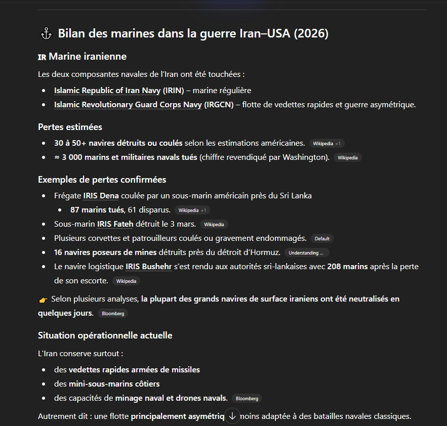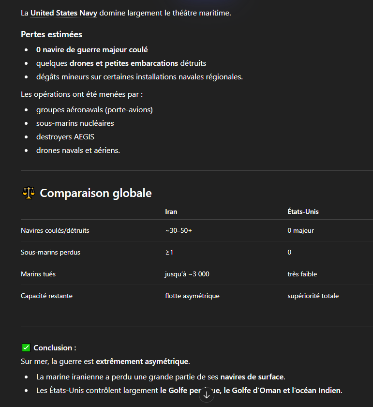Maintenant regarde la proportion de la marine dans l'armée iranienne, demande-toi pourquoi les américains n'ont toujours pas pris le contrôle du détroit et gardent toujours leurs navires bien au large du littoral, qu'il n'y a toujours pas d'invasion terrestre de prévue ; les arsenaux de missiles iraniens et de drones sont toujours bien pleins, sans parler de la guerrilla qui attend les troupes américaines sur le territoire national