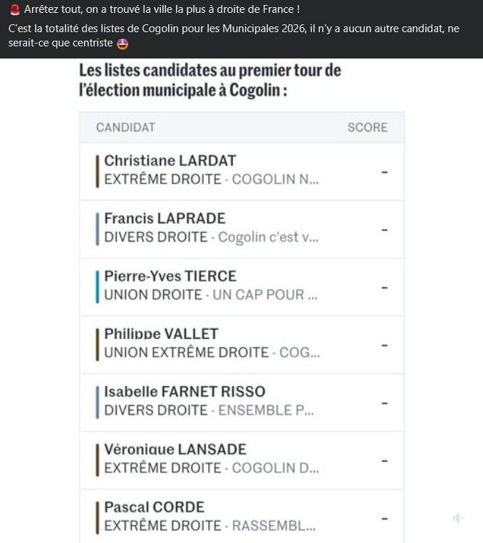 Perso 2 listes: Une maire sortante gauchiste spé écriture inclusive dans la 40ene et une boomerde avec les projets habituels typiquement boomerde que personne ne veux