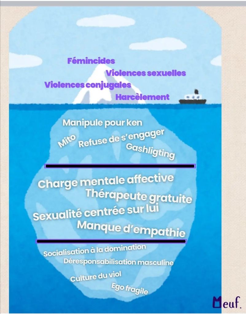 J’ai quand même bien l’impression que cet iceberg c’est le gauchisme. Un mec de droite tradi aura moins tendance à faire ça … enfin je parle de mon expérience, Même si je suis pas un féministe nazi comme on peut en voir certaines il faut bien avouer que des femmes subissent les hommes. Et pas que des noirabes.