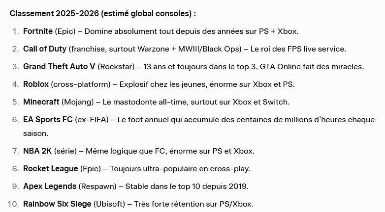 Alors je suis d'accord avec le fait que jouer a Fortnite en 2k26 c'est plus que moyen, en revanche roblox pas vraiment je dirais même que ça n'a rien a foutre dans ce top puisque c'est une plateforme qui héberge des jeux c'est pas un jeu en lui même