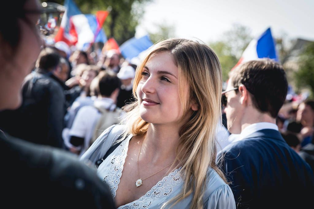 L'image représente un groupe de personnes rassemblées dans ce qui semble être Paris. Au premier plan, une jeune femme blonde sourit, entourée d'autres personnes. À l'arrière-plan, une foule brandit des drapeaux français, créant une ambiance festive.