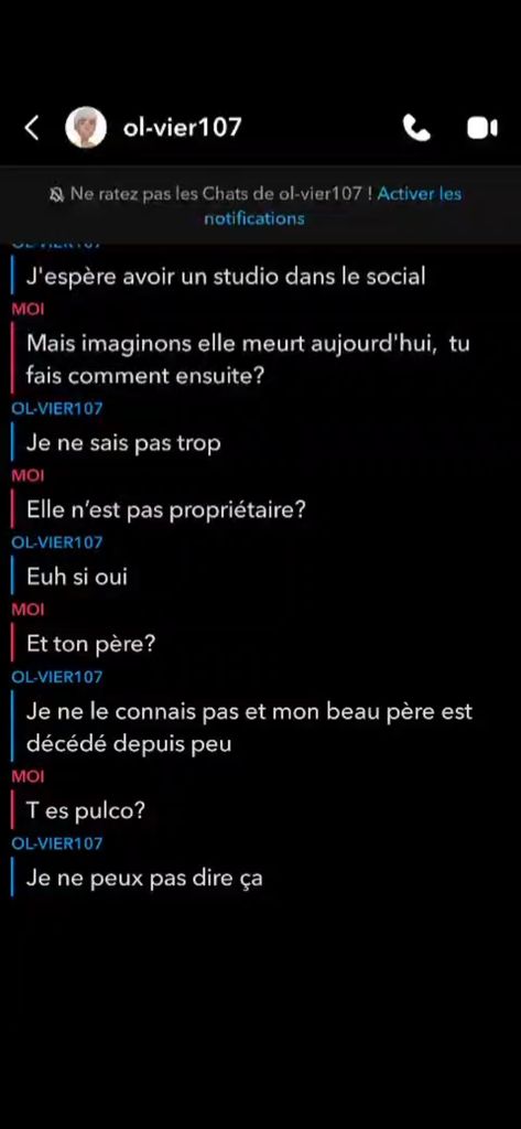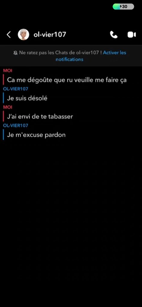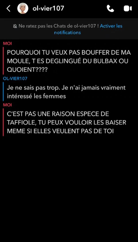 Ce pd m’a ajouté sur snapchat pour "me matter" cette grosse tafiole. Alors je lui demande pourquoi il va pas draguer des meufs au lieu d’etre un gros pd, et il me raconte qu’il vit chez sa mere et espère recevoir des aides social et dégoter un studio social ayyaaaaaa,