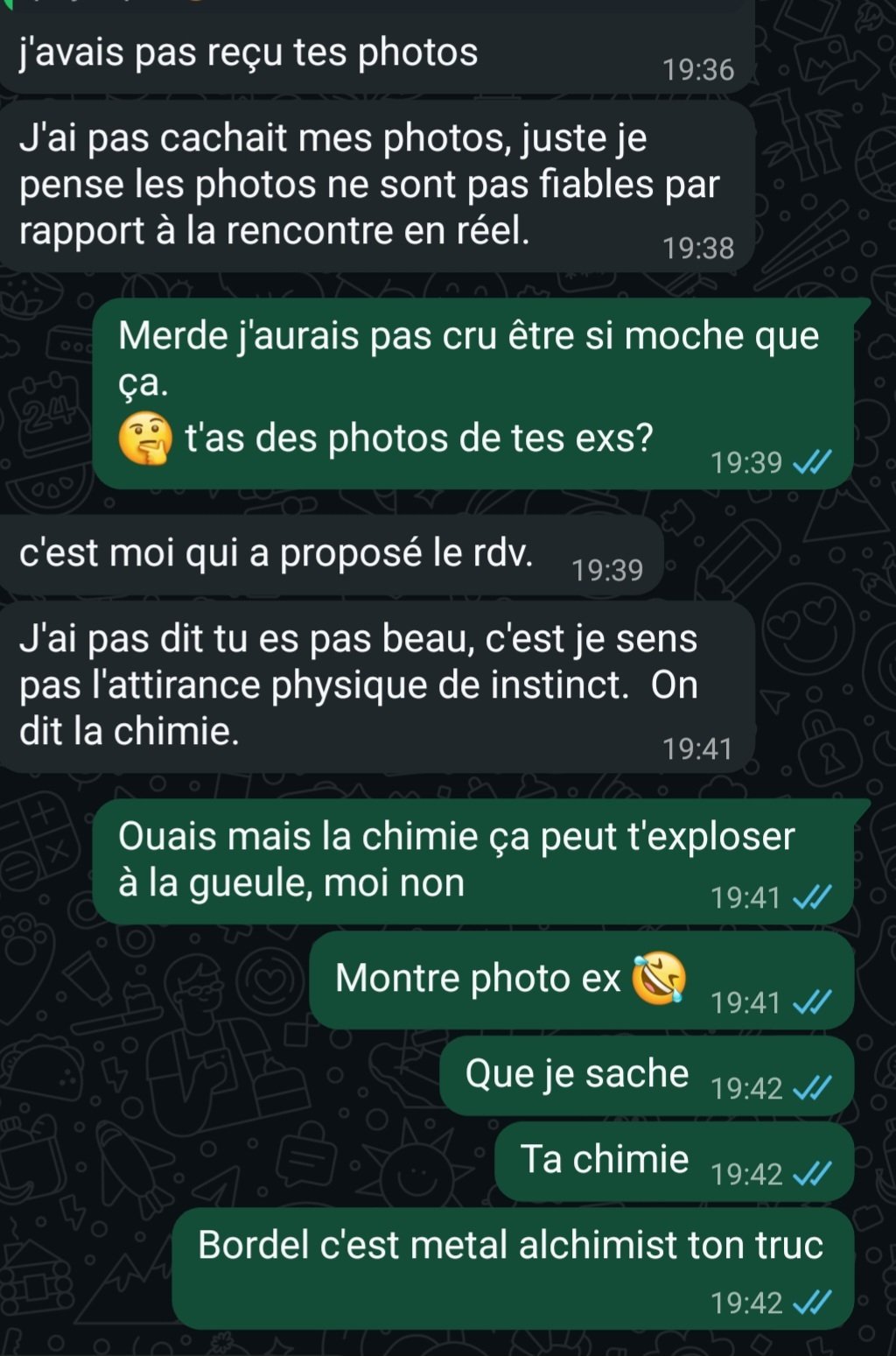 Tellement cringe vos conversations les jean-tinder je suis heureux de ne pas être dans le marché qd je vois ça