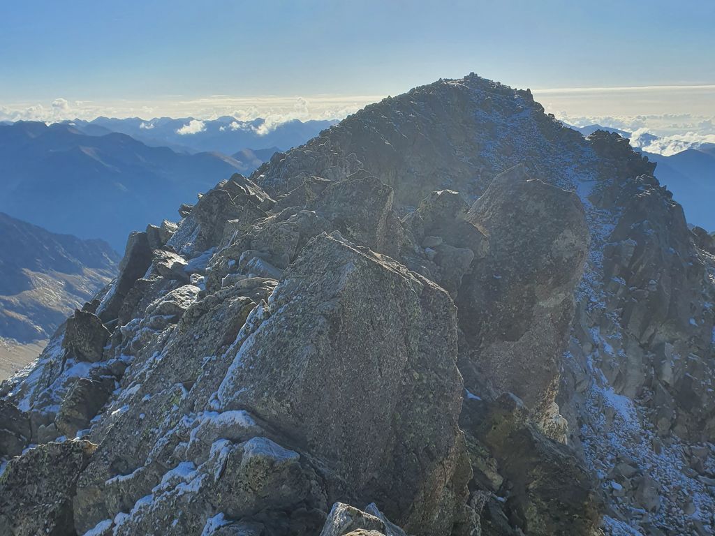 Pour les plus téméraires vous pouvez passer sur l'arête, entre l'anticime et le pic principal, mais attention le crux est à la fin avec un gendarme un peu éclatax (entre II+ max mais quand même une expo de II+ également)