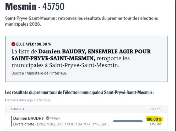 « Dans cette commune, une seule liste était candidate au scrutin municipal. Le taux de participation s'élève à 40.81 % (1.782 votants sur 4.367 inscrits). »