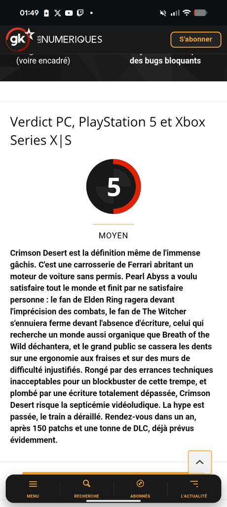 j'en ai rien a faire de gamekult. Crimson desert j'ai juste vu une hype a cause des trailer de gameplay, mais j'ai vu personne dire que c'était exceptionnel vu que personne a le jeu entre les mains.