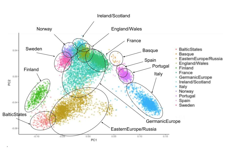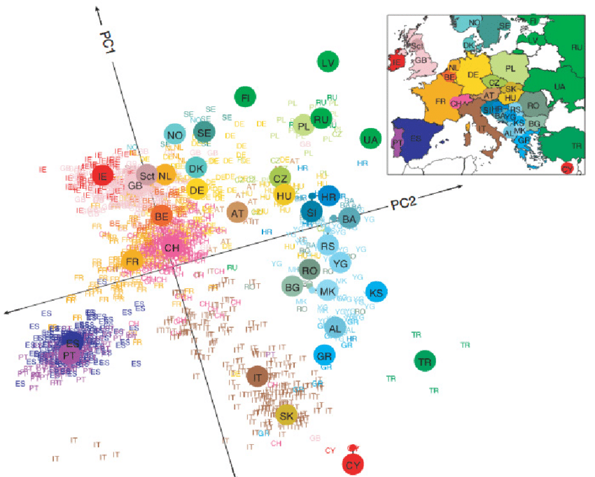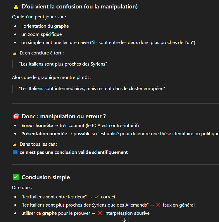 Sur des pca qui prennent que l'Europe on voit que les européens de l'ouest et de l'est sont rapprochés, alors que les italiens restent éloignés