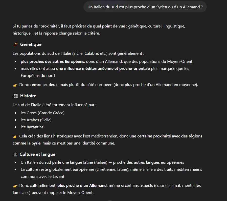 Mais génétiquement parlant un italien du sud est plus proche d'un syrien que d'un allemand