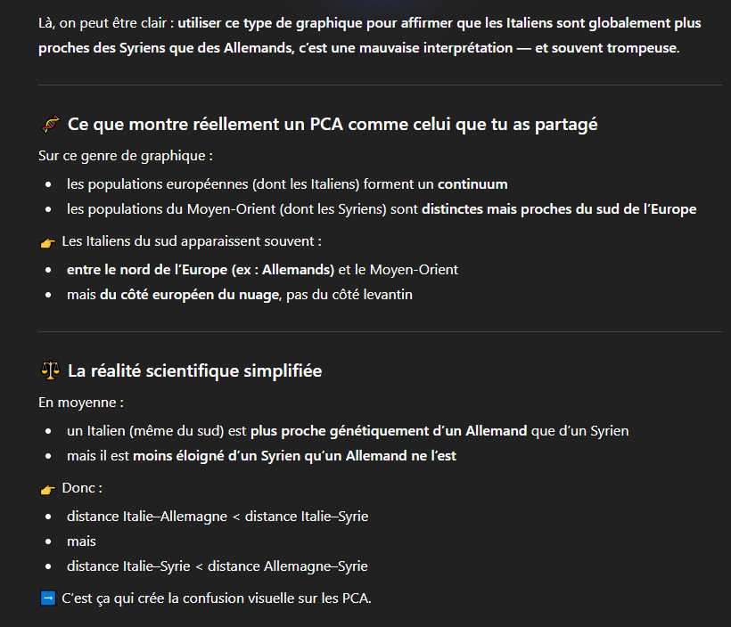 Edit importante : Tu sais probablement pas lire ce genre de graphe, mais il faut ce focus que sur la partie PC1, car elle focus que sur la distance génétique entre européens (droite du graphe) et moyen orientaux (gauche du graphe).