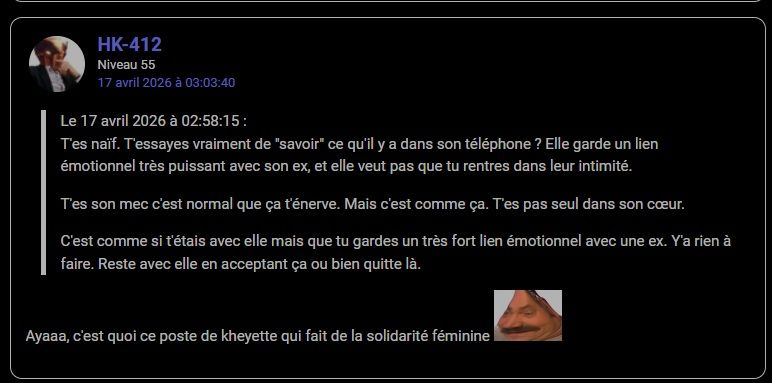 Les lacunes dans les limites. Si elle garde le lien, c'est la ligne rouge pour juste une humeur. Les non dits et le fait de clamer une intimité mais bon, c'est vraiment qu'il y a un problème chez les deux.