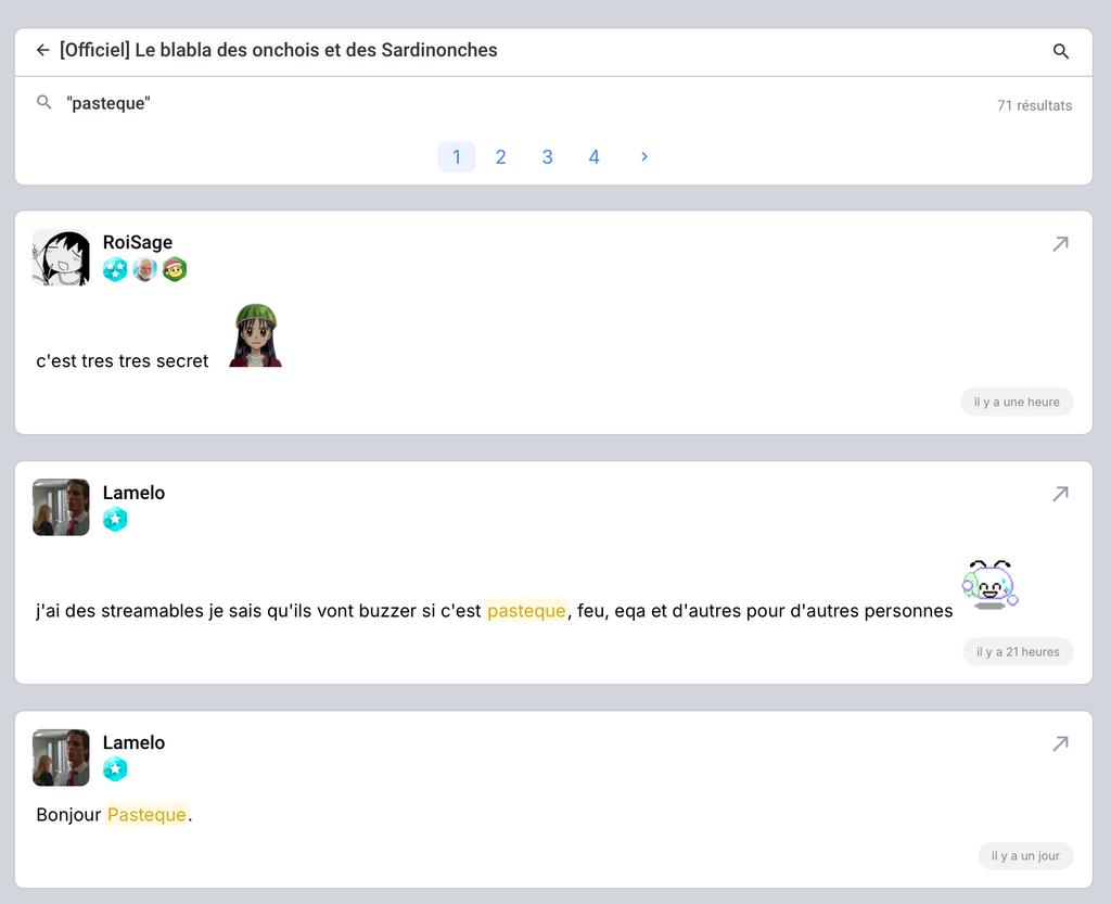 🔍 Recherche dans un topic : Une loupe apparaît en haut à droite de chaque topic. Tapez une recherche pour retrouver un message précis au sein du topic.
