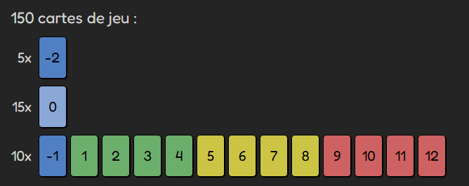 Avant-partie : Chacun reçoit DOUZE cartes faces cachées et doit en retourner DEUX (elles vont de -2 à 12)