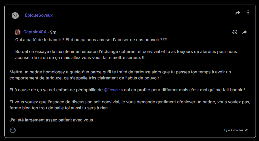 Un peu strange les embrouilles en modé... Enfin, j'ai jamais vu Freudien comme un souci. J'ai joué au poker souvent avec et j'ai pas vu non plus de propos polémiques, mais bon, j'ai loupé des chap, qui sait ?